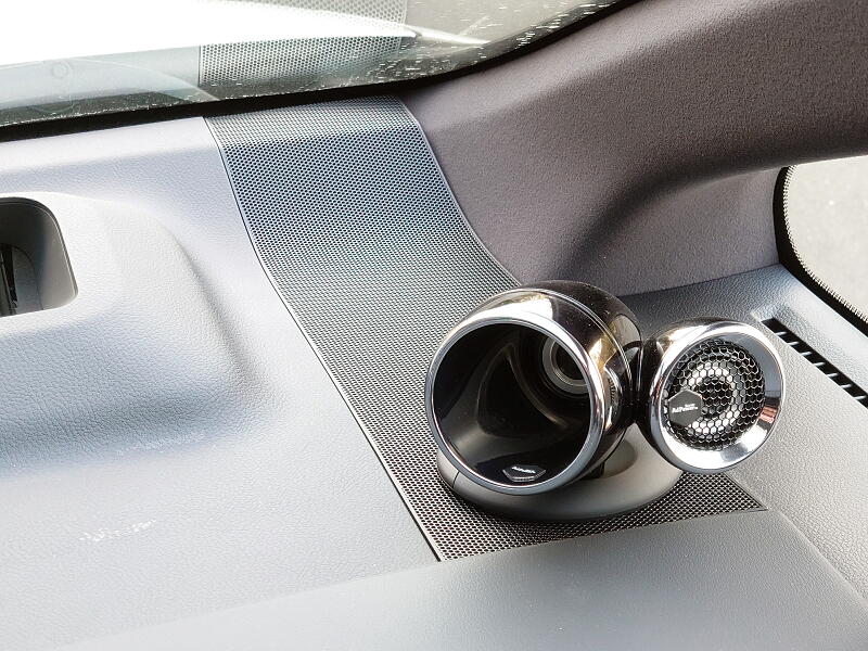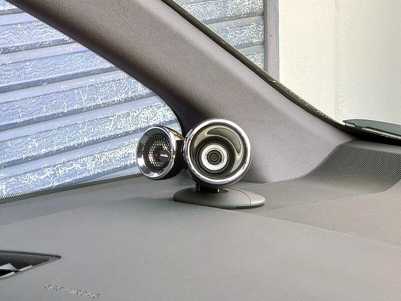 ホーンがついてない方の貼る位置は迷ったが、この位置だと反対側の座席から見るとスピーカーが隠れてしまうけど「ダブルツイーターシステム」的にはこのツイーターからの音は反対側に聴こえない方が良いので、これでOK。