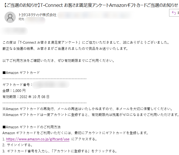 これは詐欺メールではなくTOYOTAからの本物メール。少し前にT-Connectに関するアンケートに回答したことがあったけど、その謝礼のAmazonギフト1,000円分が当選したという連絡メールでした。