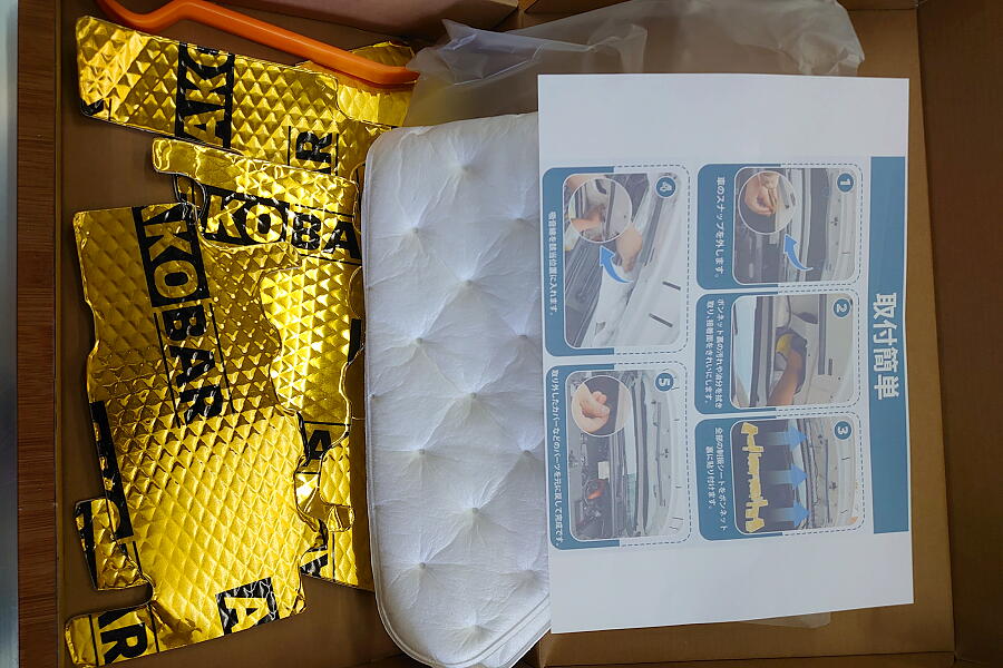 ↑ゴールドの制振シートと吸音綿のセットにクリップ外し用工具。取説は付いていないので商品ページの取付方法をプリントアウトして早速施工開始。
