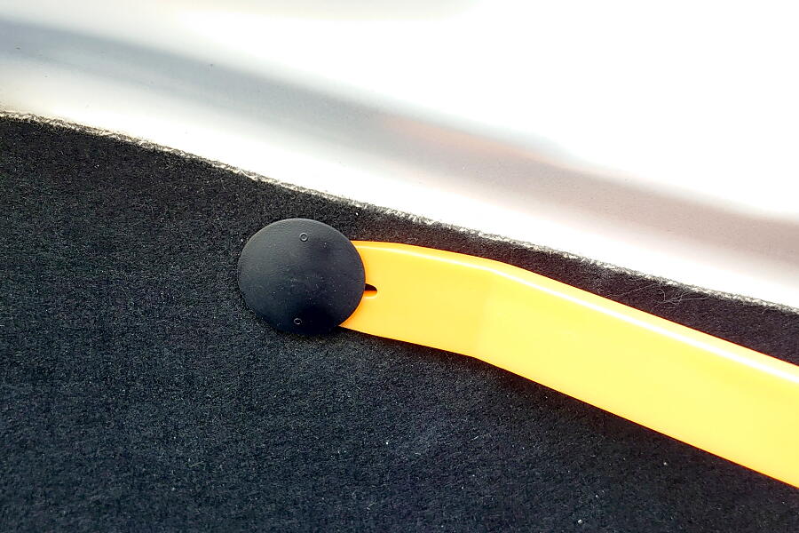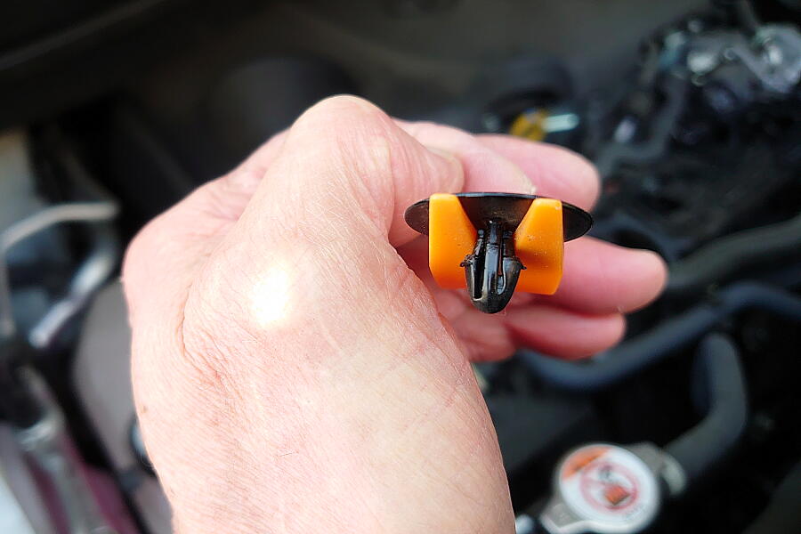 ↑ボンネットを開けると黒いカバーが5カ所のクリップで留められているので、付属の工具でクリップを外すのだけど、工具を差し込む位置に注意↓