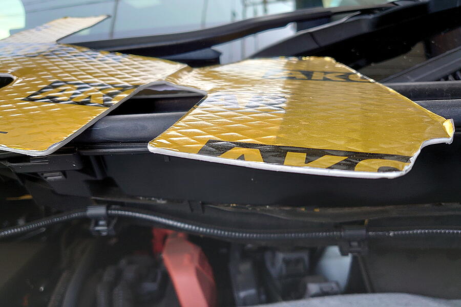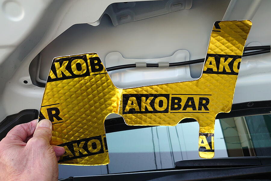↑ボンネット裏に貼る制振シートは、2mmほどの厚さの制振材の裏に両面テープ、表側はゴールドのアルミシートで高級感があり、まさに「デッドニングシート」という感じだ。