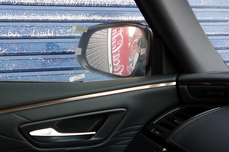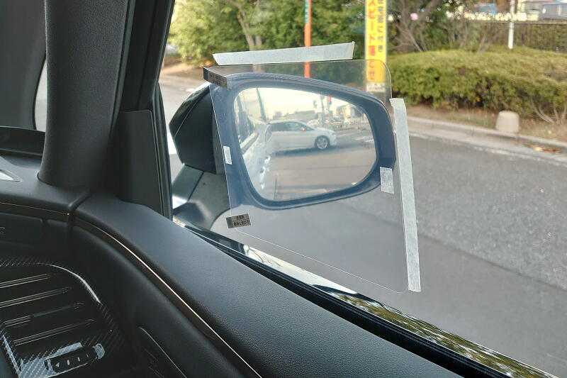 まずは助手席側から。保護シートを剥がさずに小さい両面テープを2カ所に貼り、運転席に座ってドアミラーが見える位置にフィルムを仮付け↓