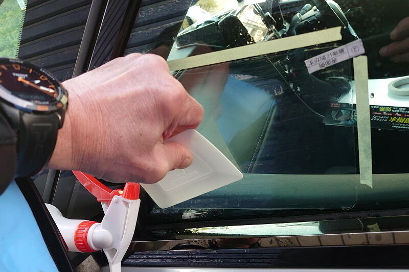 サイドガラス外側とフィルム接着面に施工液(水に中性洗剤を1%混ぜたもの)をたっぷりスプレーし、位置決めのマスキングテープに合わせてフィルムを貼り付ける↓