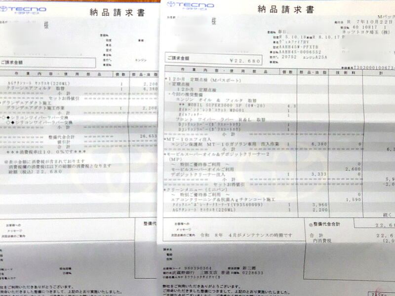 点検にかかる費用は「メンテナンスパック」で新車購入時に支払い済みなのだけど、エンジンオイルを上級グレードにしたりエアコンクリーニングなど、ディーラーお奨めのメニューも全部追加したのでその合計金額22,680円を支払った。