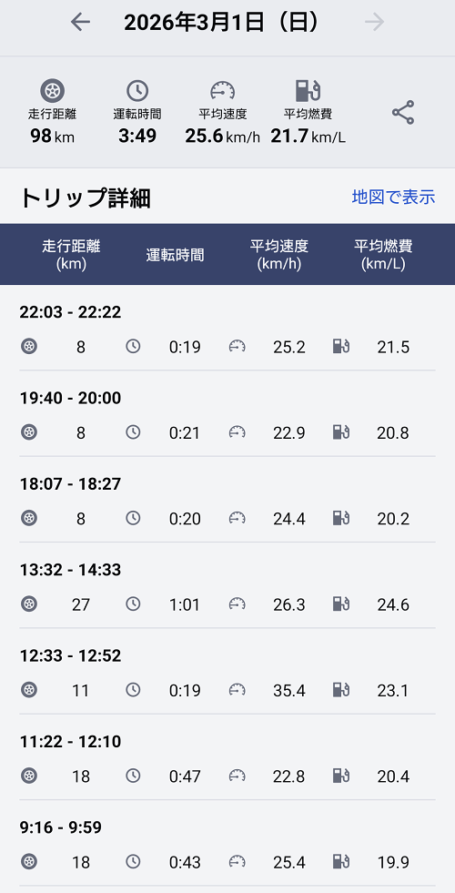 その後の仕事場と自宅の往復でもすべて20km/L越えで、1日トータルでも21.7km/Lという燃費↓