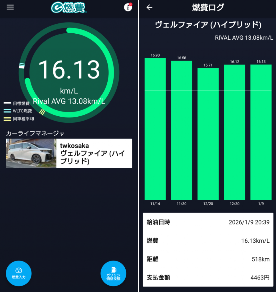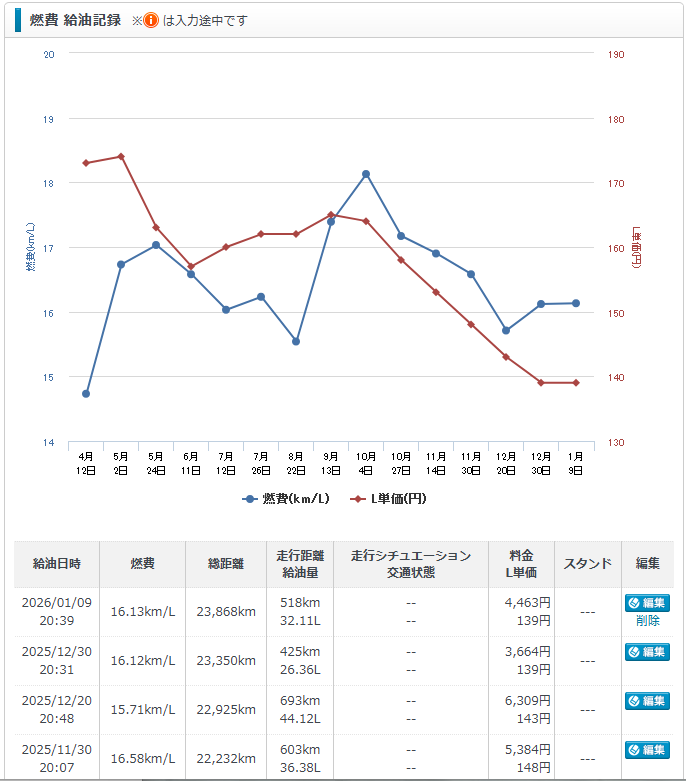 そして燃費はというと、ここのところの厳しい冷え込みの割には健闘し、16.12km/L(12/30)16.13km/L(1/9)とやや持ち直している。
