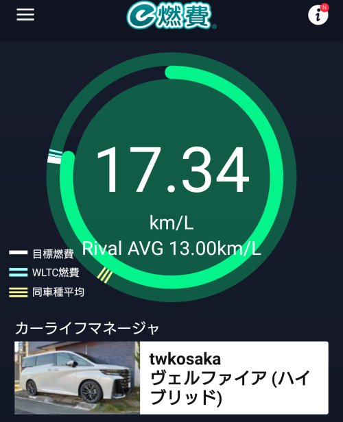 う~ん、17.34km/Lに下がってしまいました。