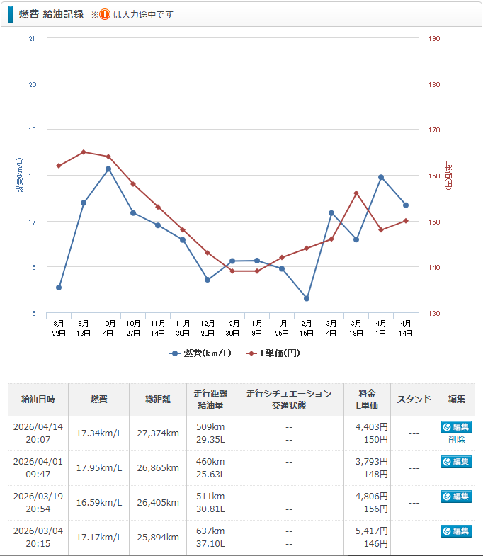 もう上がったり下がったりの繰り返しだけど、平均的には燃費もガソリン価格も上昇傾向ですね。