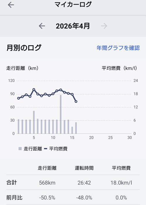 4月に入って順調に燃費は伸びていて、昨日時点で4月の平均燃費は18.2km/Lだったのだけど、今日点検に出したせいでガクッと落ちて18.0km/Lになってしまった↓