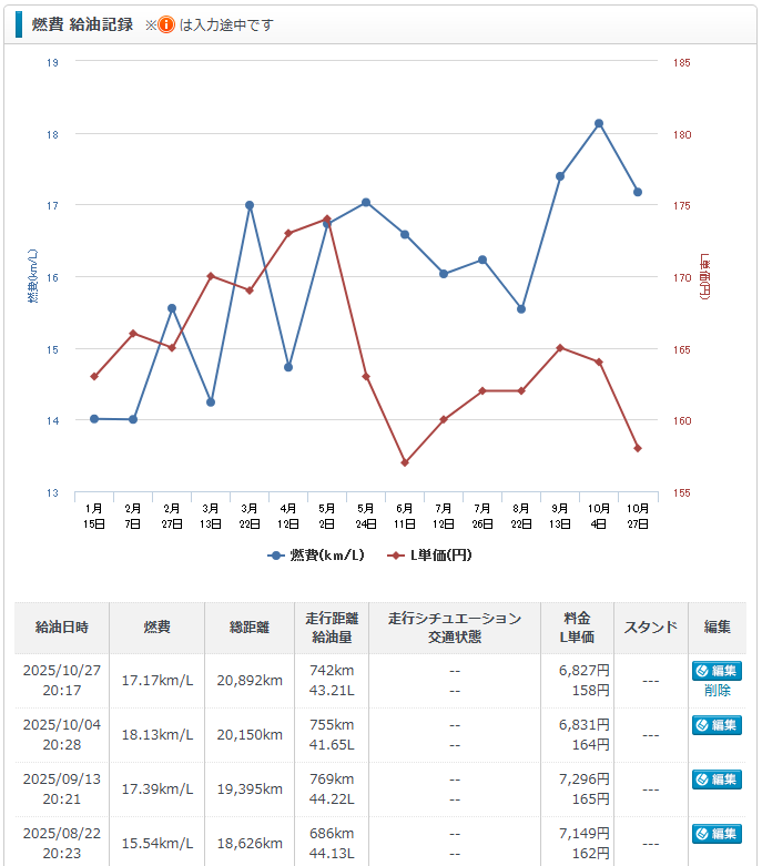 6月以来の150円台(158円/L)も気温低下の影響で燃費は前回より悪化