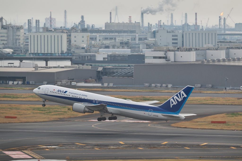 ↑京浜工業地帯をバックに離陸するANAのB767。う~~~ん、写真的には第3ターミナルの方が背景がスッキリしてていいかも。ゲートブリッジも見えるし。