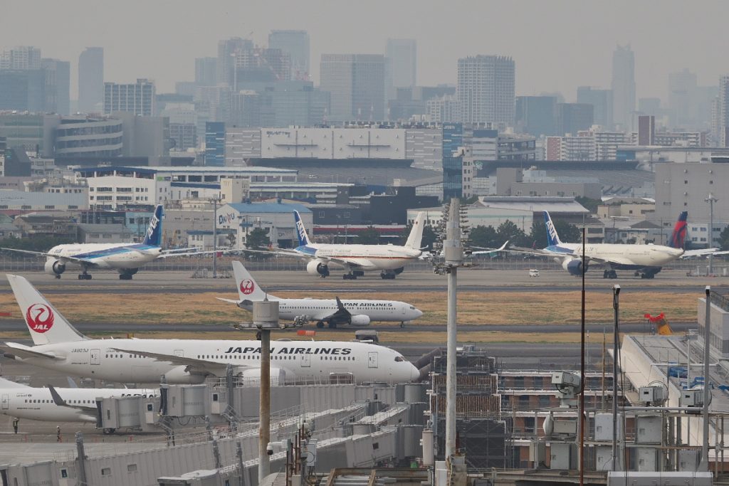 この日は曇りがちで空気の透明度も低く、綺麗な写真を撮るには厳しい条件。そしてここ第1ターミナルの展望台からA滑走路を狙うと、背景は京浜工業地帯の工場群が映り込む感じになる↓