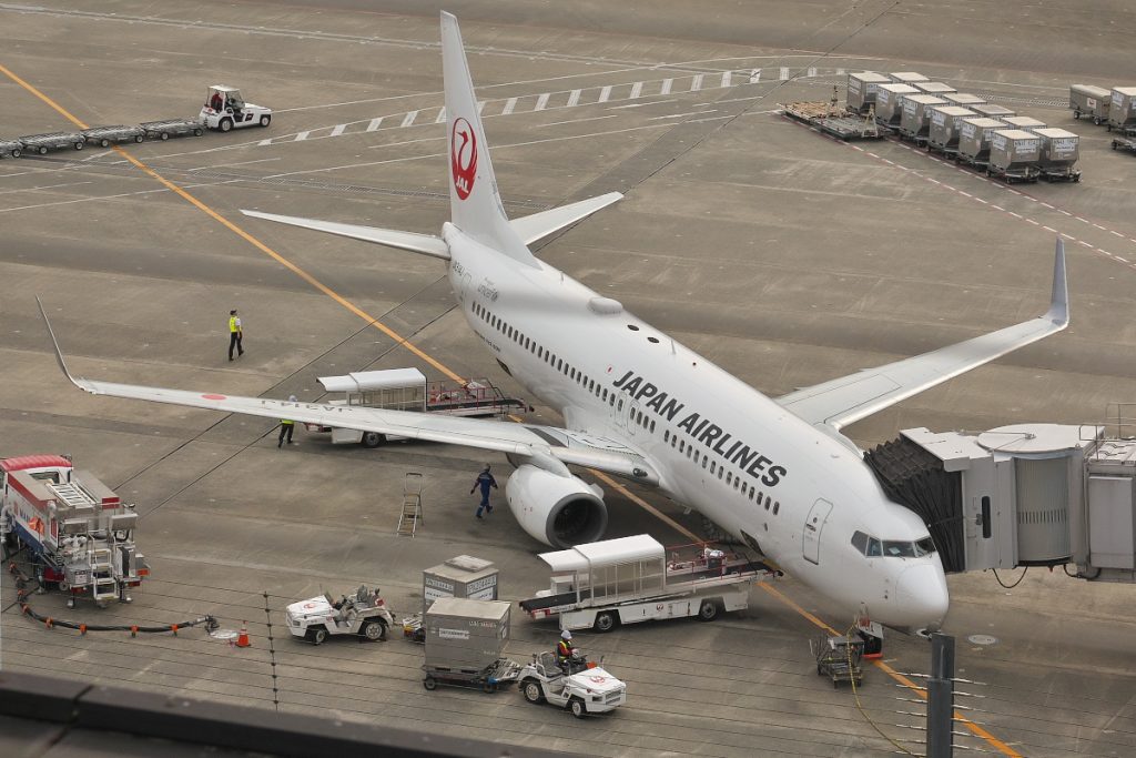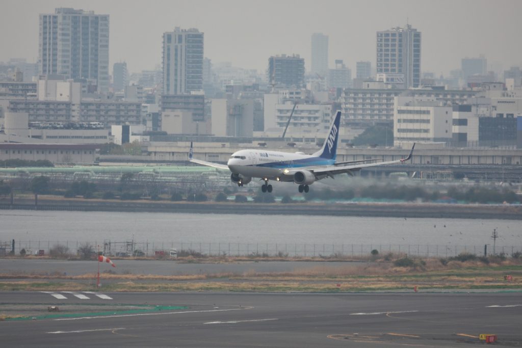 そんなこんなで、15時を過ぎて都心上空からのアプローチが許可され、RWY16Rでの着陸も見られる(はず)の第1ターミナル屋上展望デッキへ。早速ANAのB737が都心上空を経てRWY16Rへアプローチ中↓