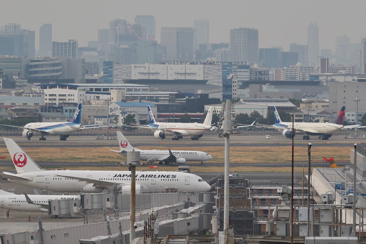 そんなこんなで、15時を過ぎて都心上空からのアプローチが許可され、RWY16Rでの着陸も見られる(はず)の第1ターミナル屋上展望デッキへ。早速ANAのB737が都心上空を経てRWY16Rへアプローチ中↓