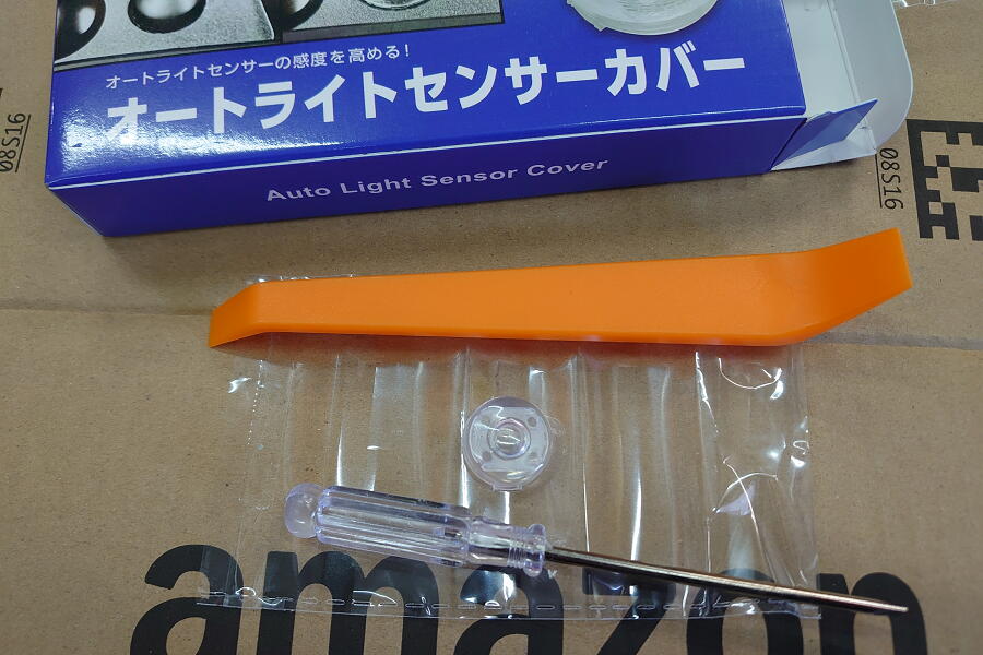 箱の中身は、透明のセンサーカバーとダッシュボードを分解するためのヘラ、カバーを取り外すためのドライバーの3点セット。取付説明書は入っていないので商品ページの動画で手順を確認したが、簡単そうだ。