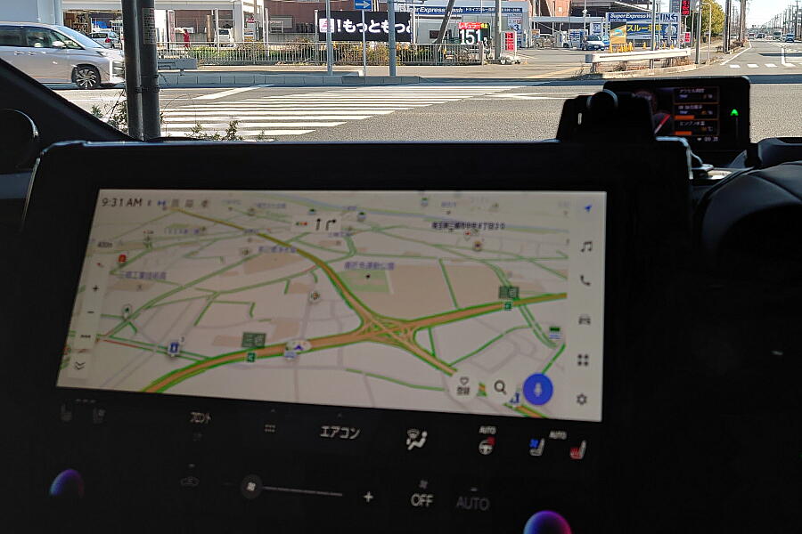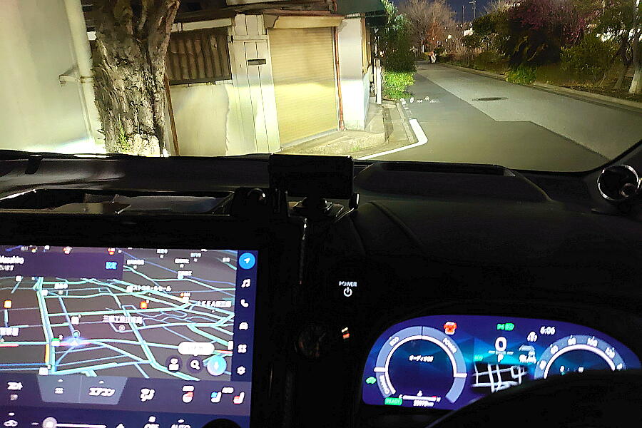 前にクルマが停まっていないのでヘッドライトが点いていないのを画像では確認できませんが、ナビ画面がダークモードに切り替わっていないことでライトは点灯していないのがわかります。
