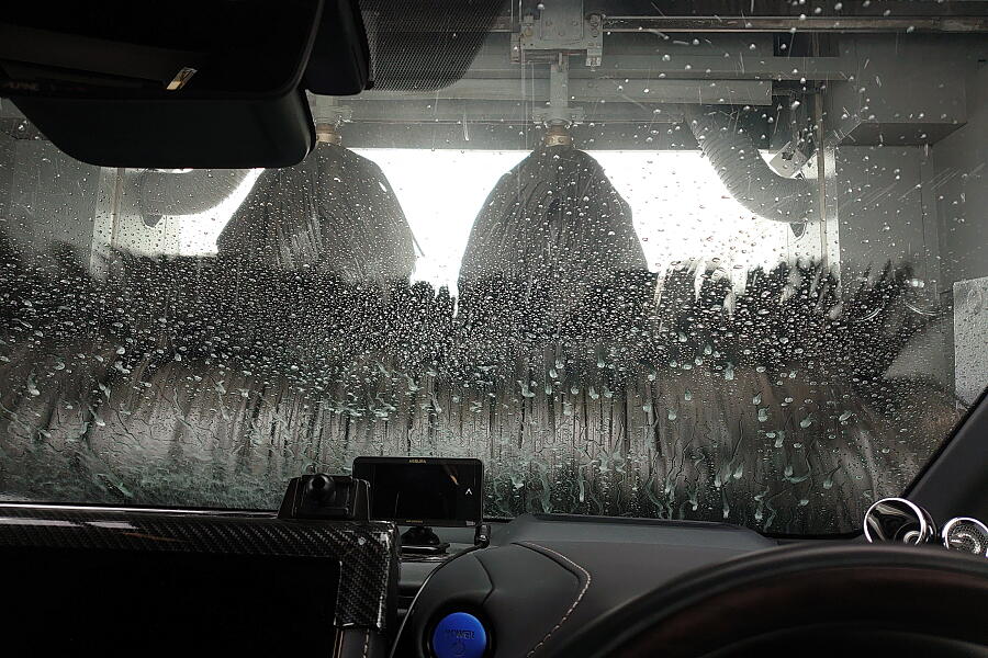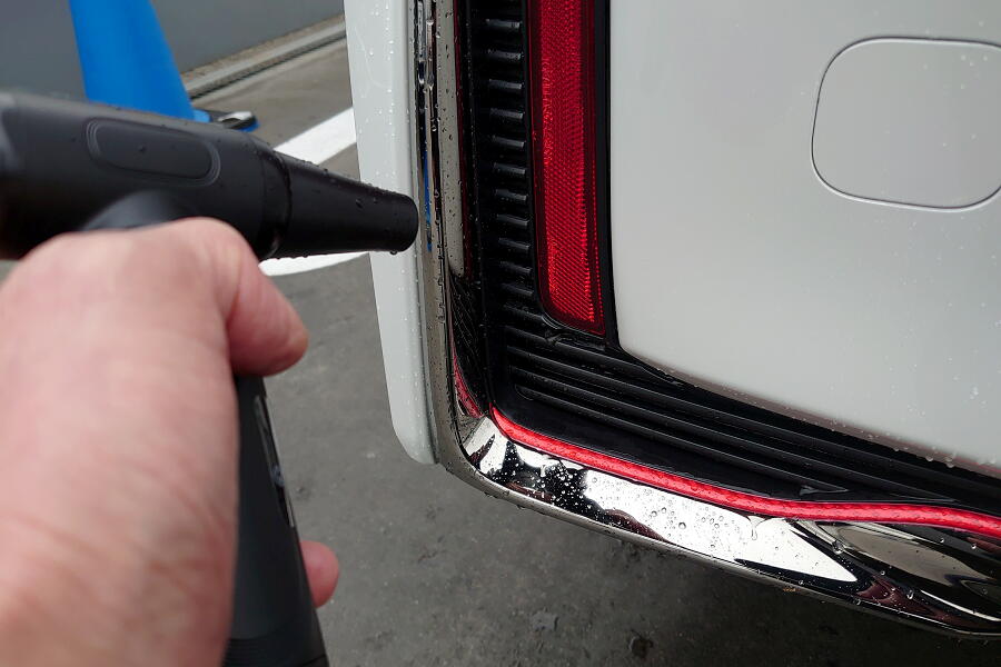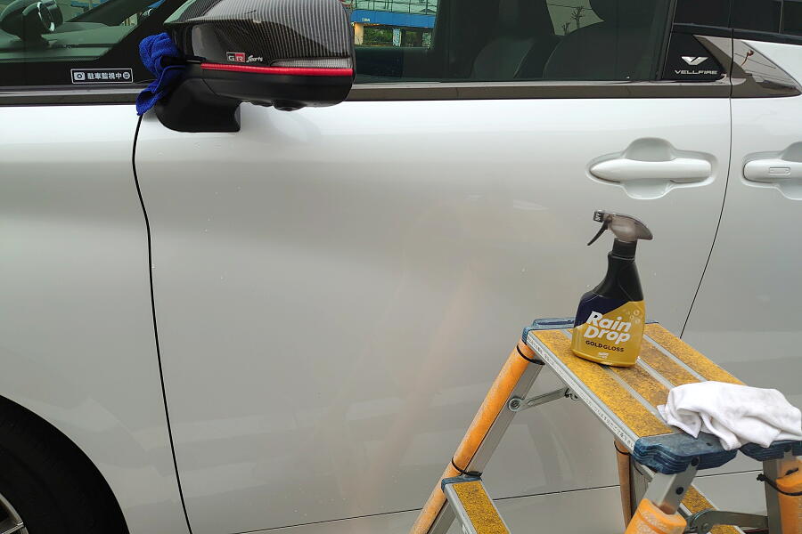 このGSの洗車場はいろいろな洗車用グッズが揃っているので、脚立をお借りして施工開始↓
