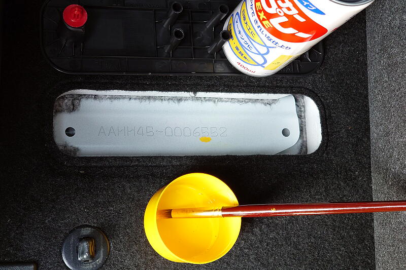 「車台番号のハイフン後5桁目下に黄ペイントを塗布」となっているけど、あのディーラーの忙しそうな様子ではやってなさそうな気がしたが、一応運転席フロアマットをめくってフタを外し、車台番号を確認すると‥‥‥↓