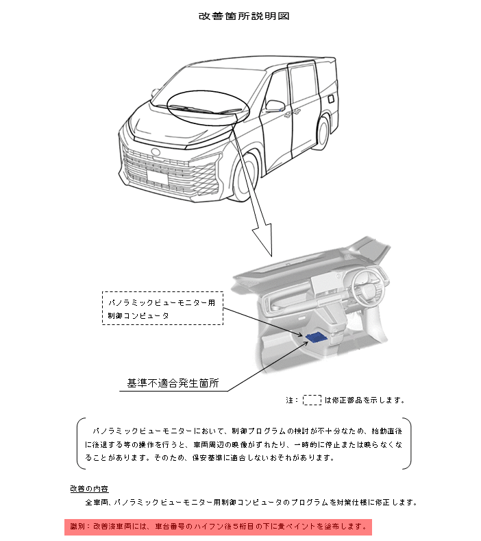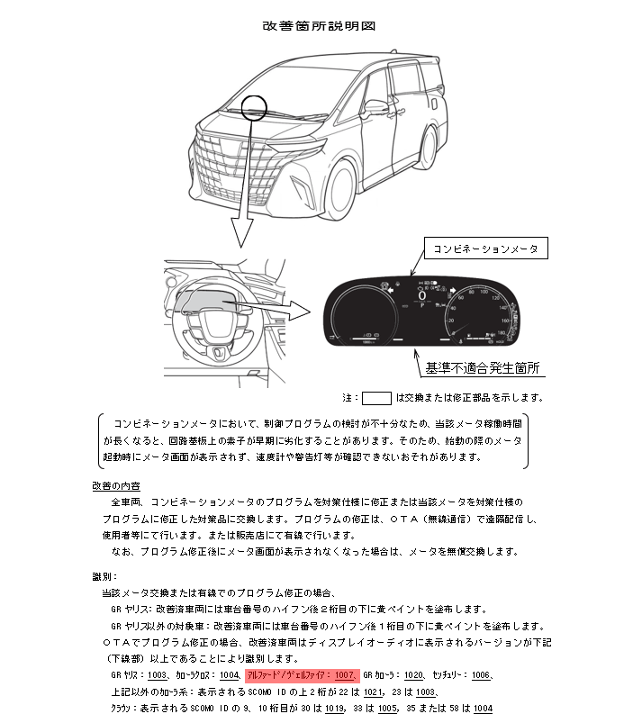 これでは本当に対策済みなのかどうかわからないので(いや、ディーラーを信用していないわけじゃないが)、リコールの通知の改善箇所の最後に記載されていた対策済みの場合の識別法を確認することにした。