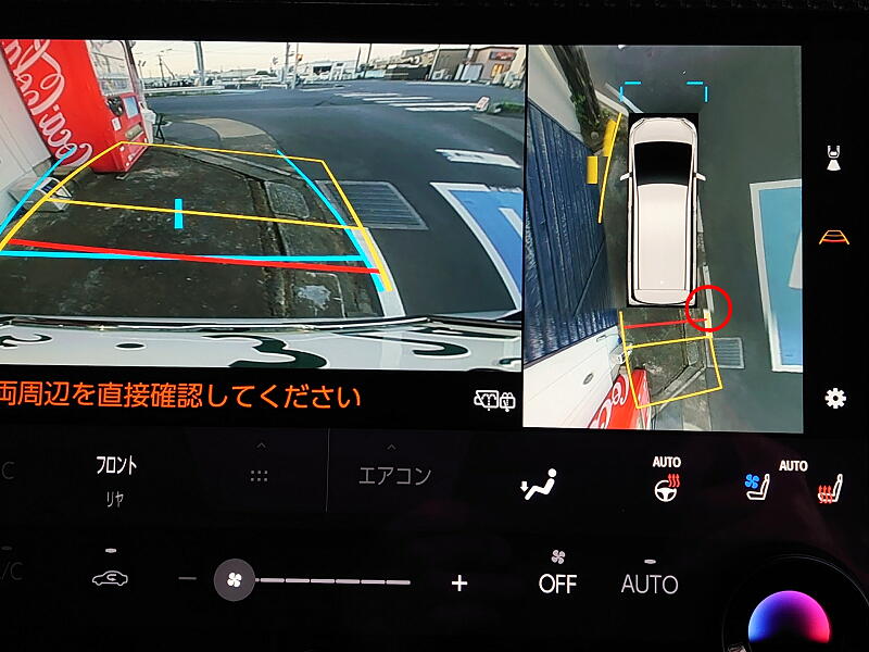上の画像は仕事場の駐車場にバックで入れる際のパノラミックビューモニターを写したもの。