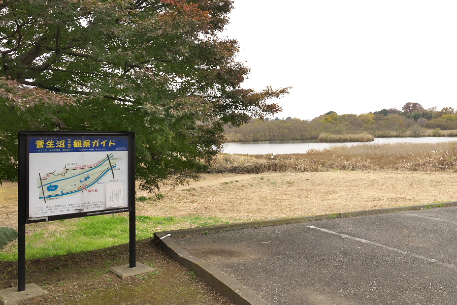 ここを曲がって右へ進むと、すぐに広い駐車場とその先に広がる菅生沼が見られる。