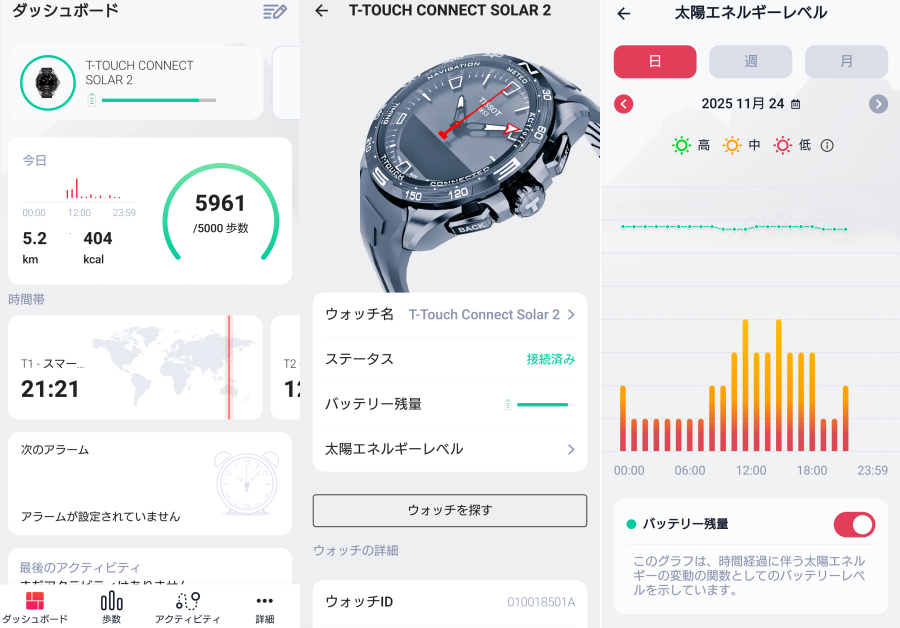 そしてTISSOT T-Touchはスマートフォンに接続して通知を表示したりできるし時刻も常に正確で充電の必要もなし。スマホのアプリで充電状態などウォッチの情報を見ることも可能となっています。