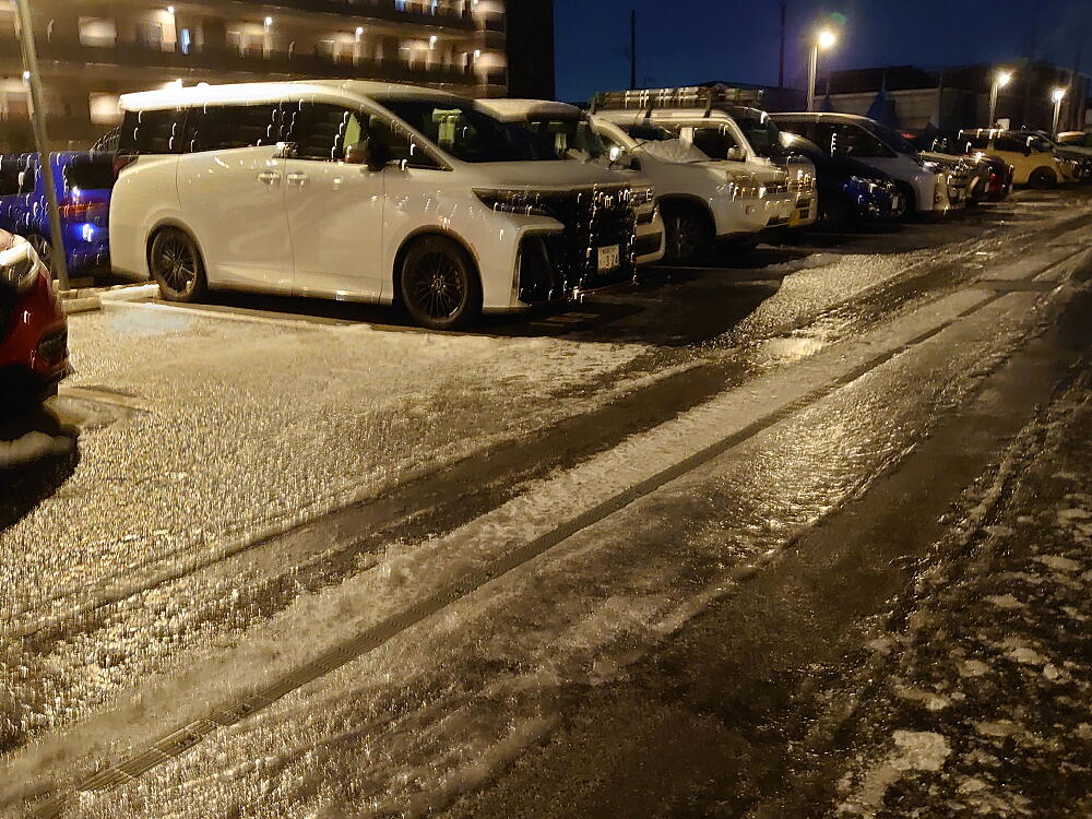 ↑駐車場の雪は融けずに一面アイスバーンになっていました。