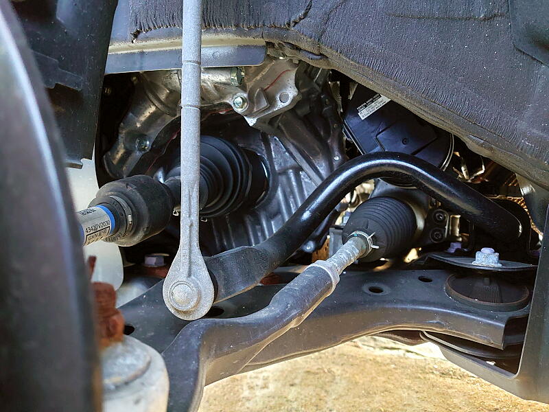40系ヴェルファイアのロールの少なさに貢献しているゴツいスタビライザーが見える。そしてスタビライザーリンクはアルミ製。そして手前にその一部が見えているサスペンションのナックルもアルミ鍛造品で、バネ下の軽量化(=運動性能の向上)のためにはコストが増すことも厭わない設計志向が見て取れる。