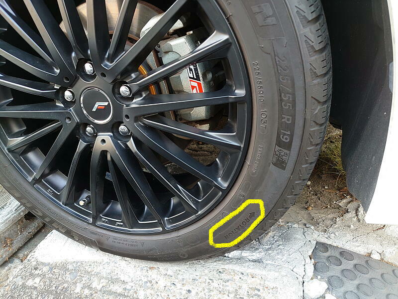 そのローテーションの入れ替え方はいろいろなパターンがあるが、私は昔から「X字型」に入れ替えていたので、今回も深く考えずに「X字型」‥‥‥つまり右後ろを左前へ、左前は右後ろへ‥‥‥という感じで取り付けて行ったのだが、回転方向が指定されているタイヤの場合、このやり方だと全部「逆回転」になってしまうのだ。